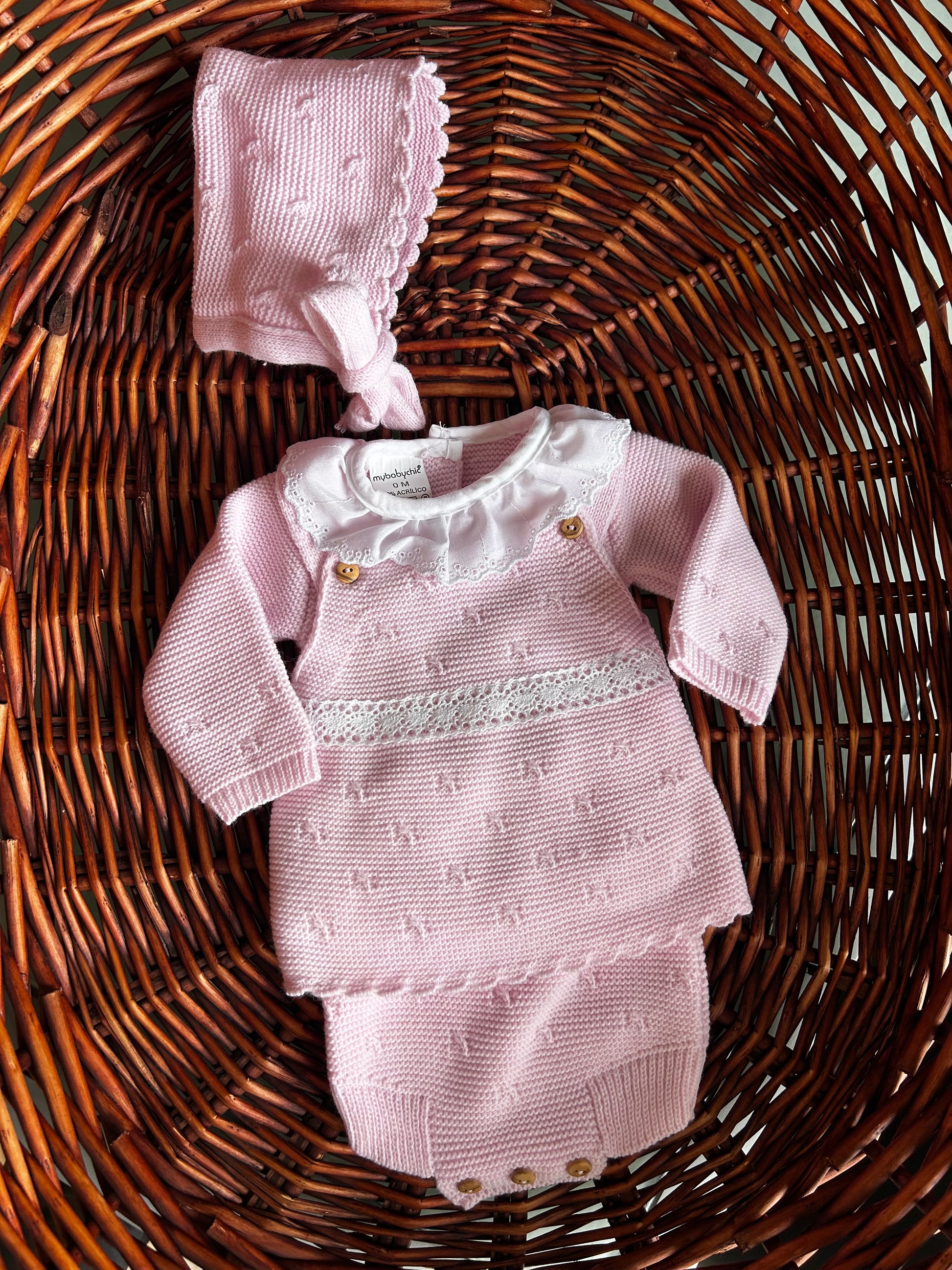 Completo 4 pezzi, composto da maglioncino, canotta in maglia, qulottina e cuffia.