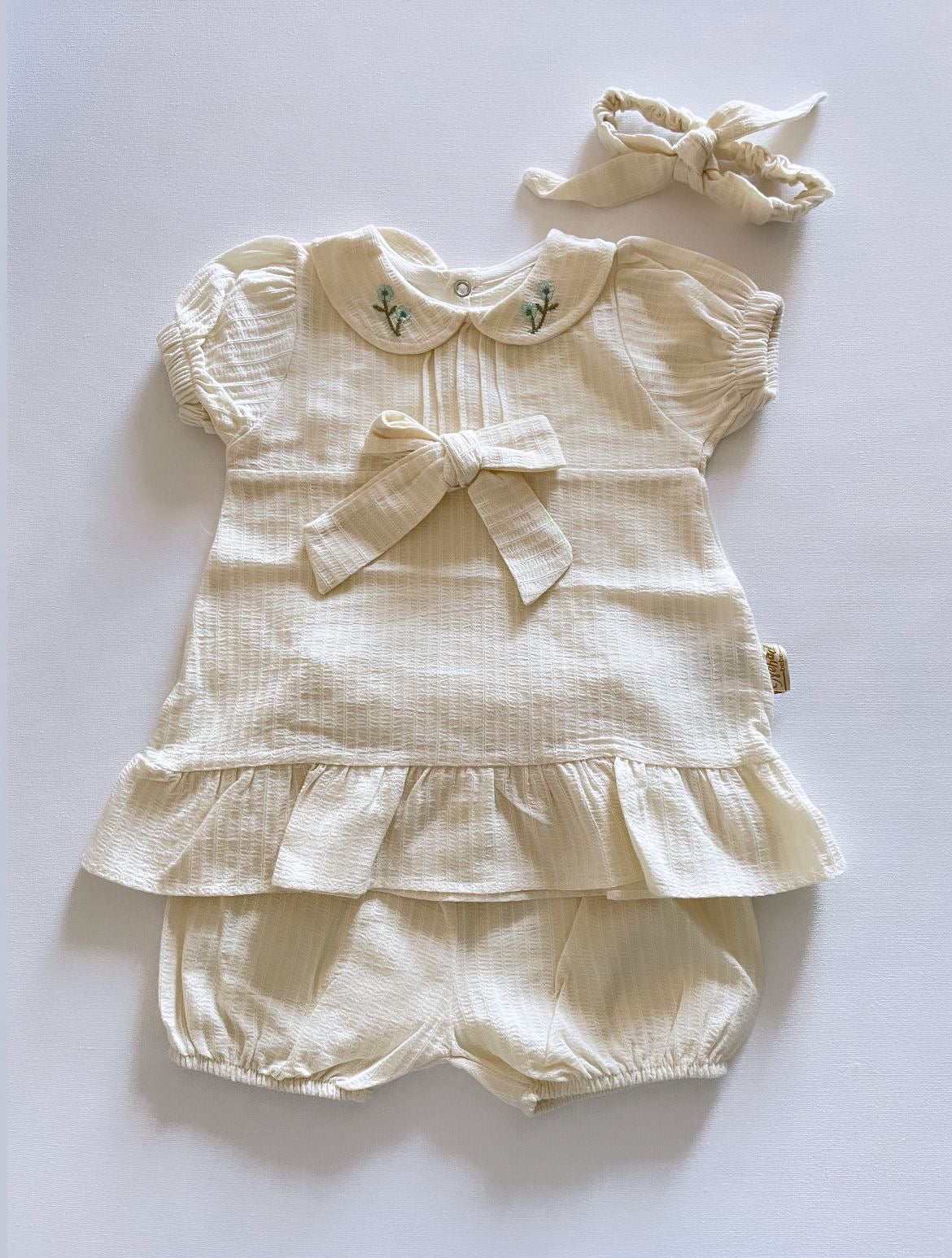 Completo ricamato beige composto da camicia,pantalone e fascia in cotone.