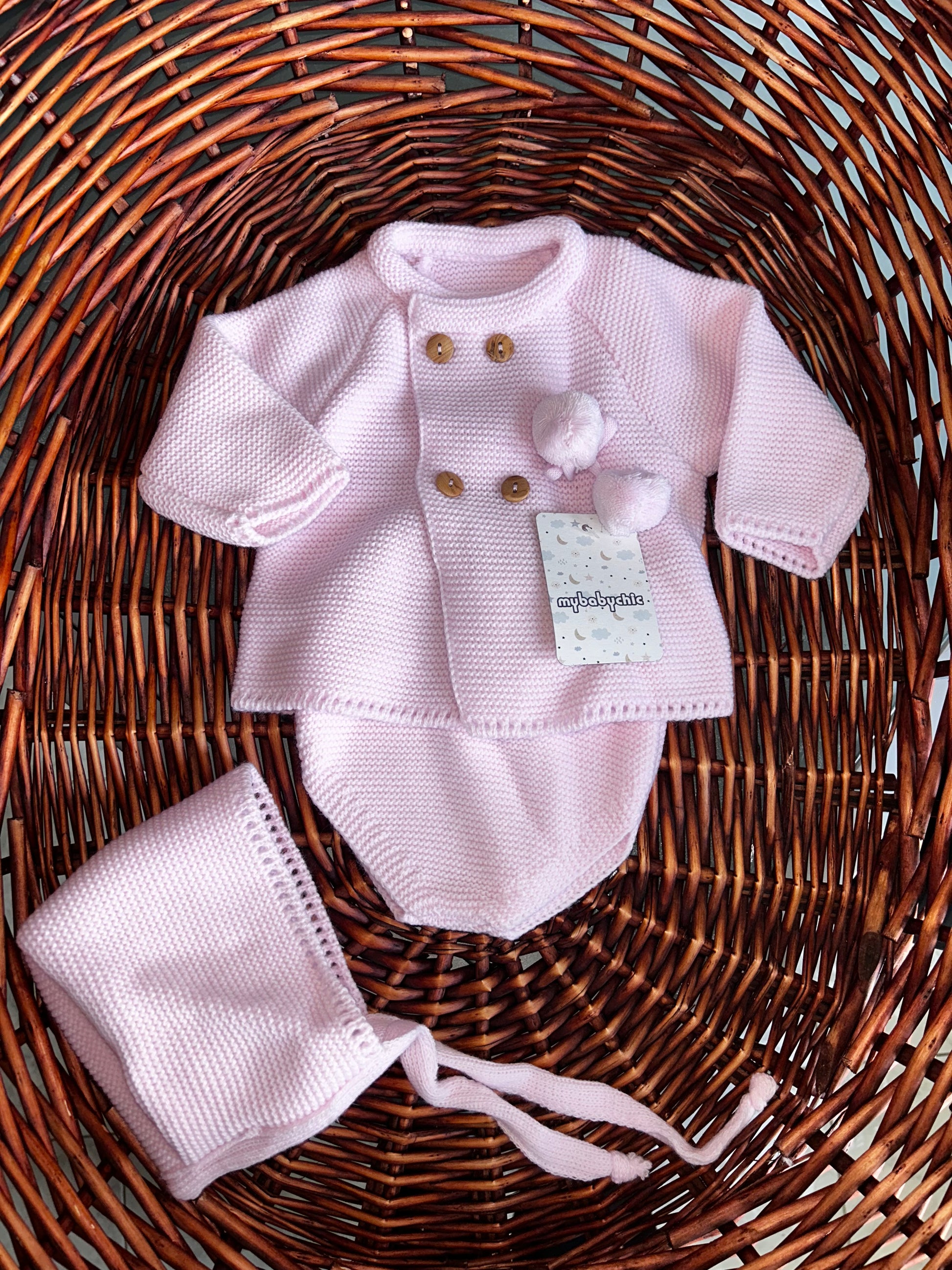 Completo composta da golfino doppio petto, qulottina e cuffia